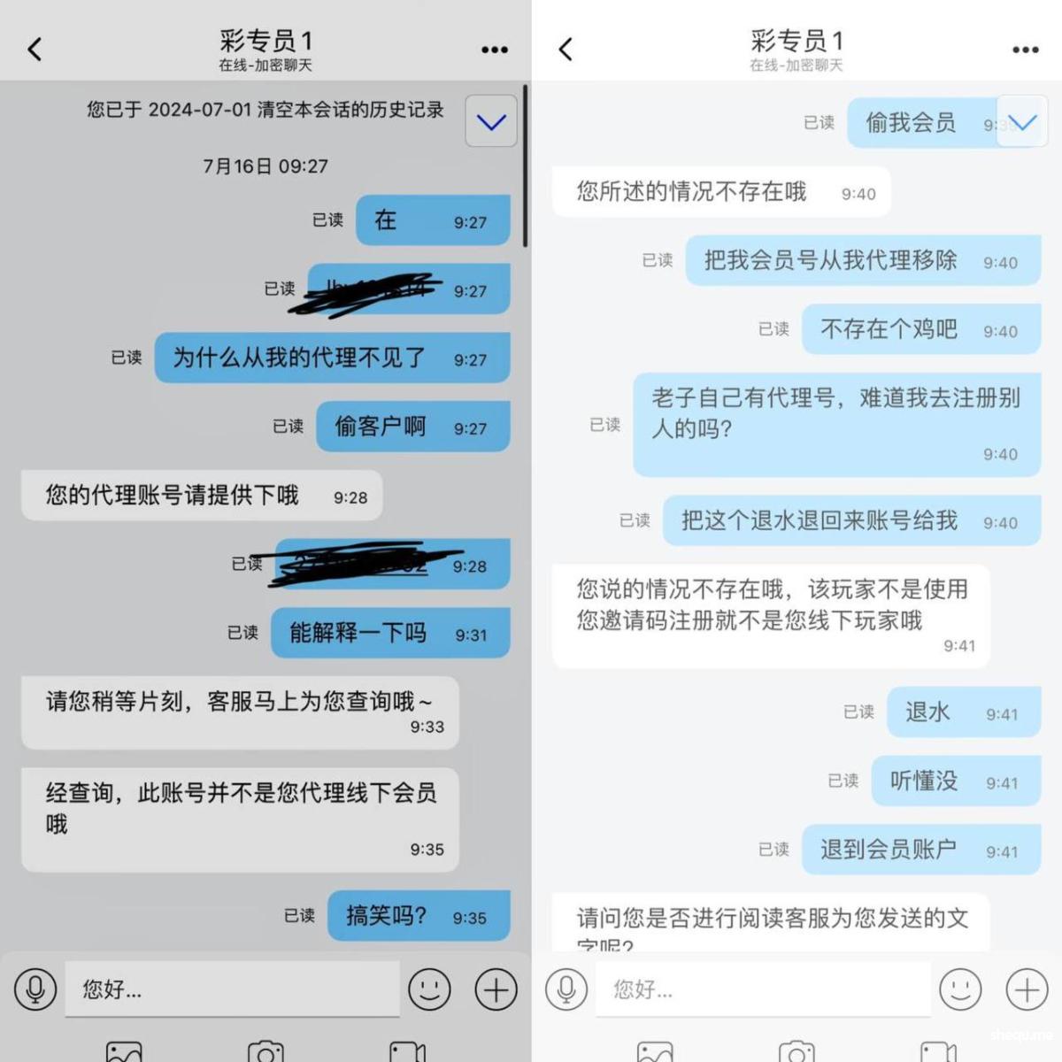 前段时间朋友说他的会员被偷了,我还不相信。直到今天,我登录自己的一个会员号,发现注册很久了之前有使用,并设置了全部退水到代理。结果今天充值玩到一半才发现会员号不在我代理名下了。联系代理客服和现在的管理人员,他们只会说是我自己注册错了。