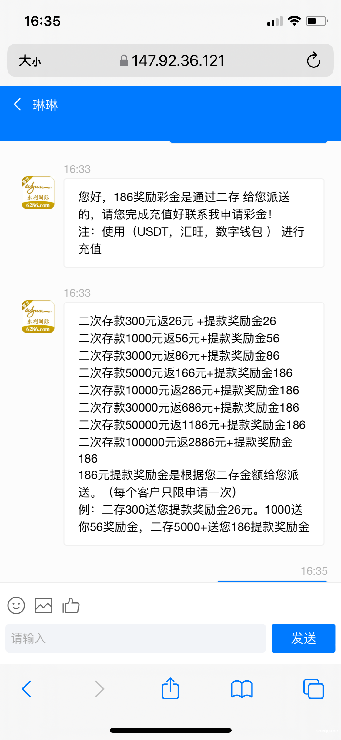 今天接到电话说注册就送彩金,结果找了在线客服,在线客服让下载旺旺商聊加专员,专员说首次盈利后提现就派发186彩金,我充值200提现236,去找专员和在线客服,一直在打太极,还说要二存,大家注意这个黑台子。