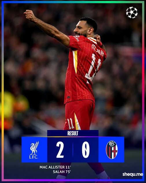 萨拉赫助攻,麦卡利斯特上半场斩获欧冠处子球,博洛尼亚运气不佳两次中柱,下半场萨拉赫内切世界波锁定胜局。